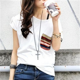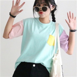寬鬆口袋撞色拼色圓領短袖上衣 [上衣] [TEE] #1-粉紅色 #2-綠色