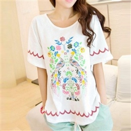 刺繡花朵肩部鏤空圓領短袖竹節上衣 [上衣] [TEE]
