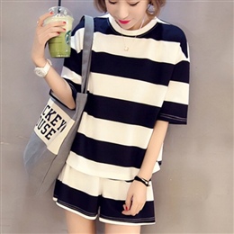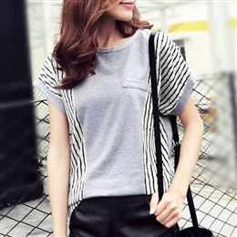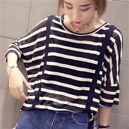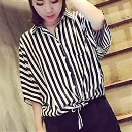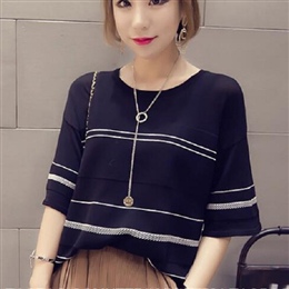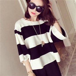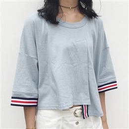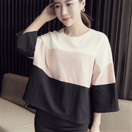撞色條紋寬鬆七分袖上衣 [上衣] #1-黑+白 #2-卡其色+白
