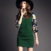 印花釘珠燈籠袖圓領拼接連身裙 [復古民族] [連身...