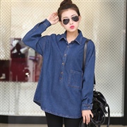 休閒寬鬆長袖開扣襯衫後背拉鍊翻領牛仔上衣 [經典牛...