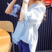 顯瘦修身休閒條紋五分袖中長襯衫 [上衣] [襯衫]