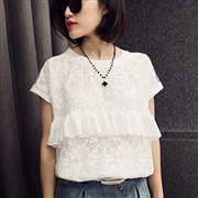 寬鬆顯瘦肩膀拼紗短袖蕾絲衫上衣 [上衣] #1-白...