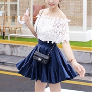 一字領鉤花蕾絲上衣高腰短裙套裝兩件套 [套裝]