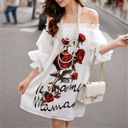 玫瑰印花一字領塔袖修身連身裙 [連身裙]