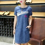 圓領復古磨白印花連牛仔衣裙 [連身裙]