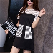 黑白撞色條紋網紗拼接大口袋連身裙 [連身裙]