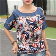露肩牛仔拼色上衣十牛仔短褲套裝 [套裝] #1-嘴...
