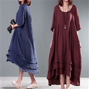 寬鬆荷葉邊前短後長連身裙 [連身裙] #1-酒紅色...