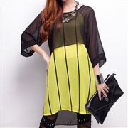 條紋印花寬鬆中袖不規則中長款上衣 [上衣]