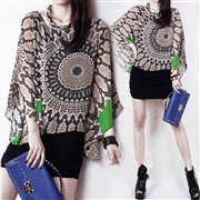假兩件套蝙蝠長袖雪紡印花拼接修身包臀連身裙 [連身...