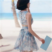 水墨露背綁帶修身印花雪紡連身裙 [連身裙]