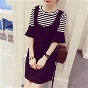 喇叭袖兩件套橫條背帶連身裙 [套裝]