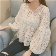 寬鬆娃娃款綁帶立體鉤花蕾絲衫 [上衣] #1-白色...