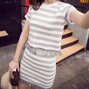 拼色橫條上衣+須須邊短裙套裝 [套裝] #1-淺灰...
