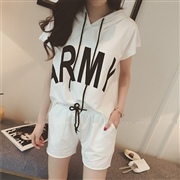 動套裝連帽印花短袖上衣+鬆緊腰闊腿短褲 [套裝] ...
