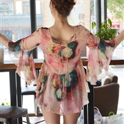 中長款荷葉袖花色雪紡衫 [上衣] #1-淺藍色 #...