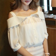 露肩一字領襯衫中袖排扣吊帶背心雪紡上衣 [上衣]
