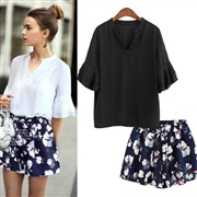 喇叭袖雪紡衫+印花短褲 [套裝] #1-白色 #2...