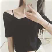 露肩純色短袖上衣 [上衣] #1-白色 #2-黑色