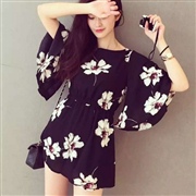 花朵印花喇叭袖鬆緊腰修身連身裙 [連身裙] #1-...