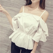 性感一字領修身荷葉邊短袖上衣 [上衣] #1-白色...