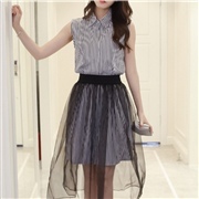 條紋無袖襯衫裙+透視網紗裙中長款兩件套連身裙 [連...