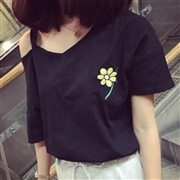 刺繡花朵肩部鏤空圓領短袖竹節上衣 [上衣] [TE...