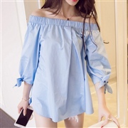 一字領露肩褶皺淺藍色上衣 [上衣]