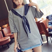 蝴蝶結圍巾裝飾寬鬆假兩件套純色中長款上衣 [上衣]...