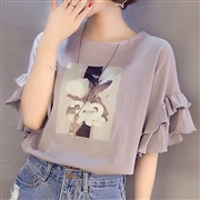 圓領荷葉袖印花上衣 [上衣] #1-白色 #2-灰...