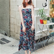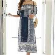 青花瓷露肩一字領民族顯瘦中長連身裙 [連身裙]