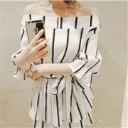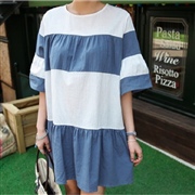 一字肩豎條紋綁帶蛋糕層連身裙 [連身裙]