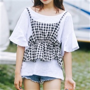 格子綁帶小吊帶背心+荷葉袖上衣兩件套 [套裝]