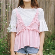 木耳邊背心+竹節條紋上衣兩件套裝 [套裝] #1-...