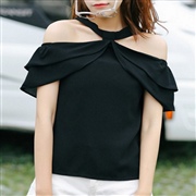 露肩雙層荷葉領一字肩雪紡衫上衣 [上衣] #1-灰...