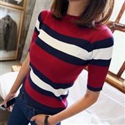 薄款修身顯瘦拼色條紋冰爽絲針織衫 [上衣] #1-...