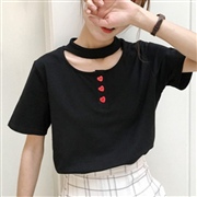 愛心桃心形紐扣裝飾掛脖領短袖上衣 [上衣] [TE...