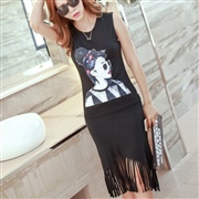 復古頭像上衣+流蘇包臀連身裙套裝 [套裝] #1-...