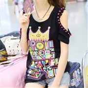 城堡印花露肩釘珠上衣 [上衣] #1-白色 #2-...