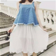 牛仔拼接雪紡假兩件背帶連身裙 [連身裙] #1-白...