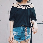 寬鬆短袖領口綁帶上衣 [上衣] #1-白色 #2-...