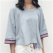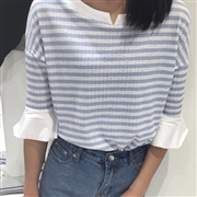 條紋拼色小喇叭五分袖上衣 [上衣] #1-藍條 #...
