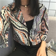 流蘇綁帶印花喇叭袖雪紡衫 [上衣] #1-藍色系 ...