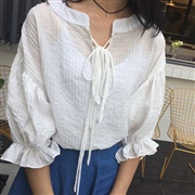 喇叭袖滾邊拼色開叉雪紡衫 [上衣] #1-白色 #...