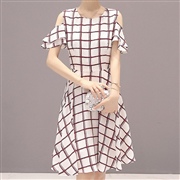 圓領肩部鏤空荷葉袖格子印花短袖連身裙 [連身裙]