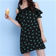 一字領人掌印花荷葉邊寬鬆露肩連身裙 [連身裙]