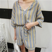 復古豎條紋雪紡襯衫高腰綁帶闊腿短褲兩件套 [套裝]...
