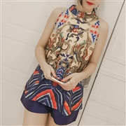 民族圖騰撞色露肩寬鬆上衣+高腰短褲套裝 [套裝] ...