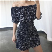 一字肩綁帶波點收腰連身裙 [連身裙] #1-藏藍色...